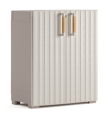 Skříň vyniká svým výjimečným designem, jednoduchou sestavitelností a dřevěnými designovými madly. Dokonale zapadne do všech prostor a díky posuvným policím s nosností 15 kg je vhodná pro uložení různých předmětů. Je nenáročná na údržbu, vodotěsná a odolná vůči UV záření, díky tomu mohou být použita v exteriéru i v interiéru. Skříň je vyzvednuta na nohou a lze ji zajistit visacím zámkem.