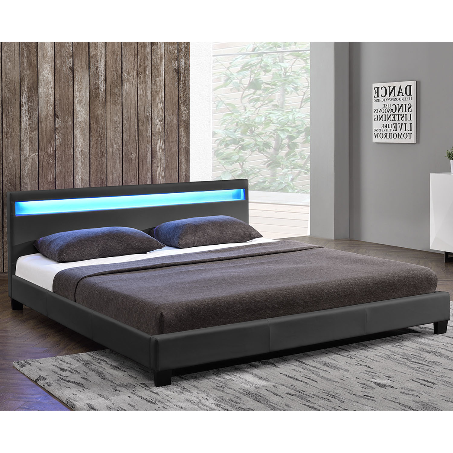 Čalouněná postel Paris má moderní design. Díky své jednoduchosti je kombinovatelná s téměř jakýmkoli interiérem. 8 cm vysoké nohy umožňují vzduchu dobře cirkulovat pod postelí. Opírejte se o pohodlně polstrované čelo postele a relaxujte při čtení nebo sledování televize. Má integrovanou LED lištu, jejíž světlo úžasně působí na tmavě šedou syntetickou kůži a dodává místnosti skvělý šmrnc. Náš dvoudílný lamelový rošt s dřevěnými příčkami a stabilizační středovou tyčí má obzvláště dobrou oporu. Představuje optimální základ pro vaši matraci 160x200 cm. Postel je vyrobena z odolného MDF dřeva a je měkce polstrovaná. Potah, který se snadno udržuje je vyroben ze syntetické kůže. Dá se snadno vyčistit vlhkým hadříkem. Čelo postele je z umělé kůže je 78 cm vysoké se zabudovaným LED osvětlením. Pomocí dálkového ovladače si můžete zvolit mezi 16 různými barvami a jasy světla. Relaxujte v atmosférickém prostředí a nepřímém osvětlení, zatímco se opíráte o pohodlné čelo postele.