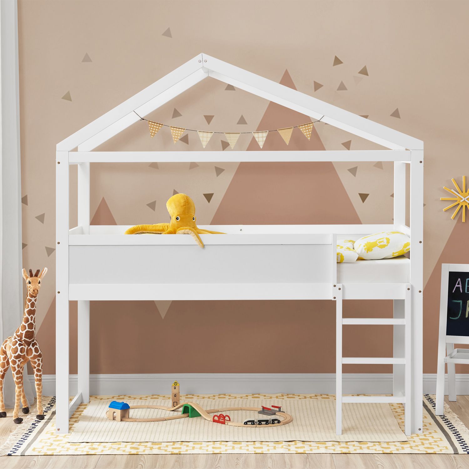 Dětská postel je vyrobena z pevného masivního borovicového dřeva pod kterou je velký prostor pro hraní. Postel obsahuje dřevěný lamelový rošt, který unese až 125 kg – ideální jako dětská postýlka. 38 cm vysoká ochrana proti pádu nabízí bezpečnost při spánku.