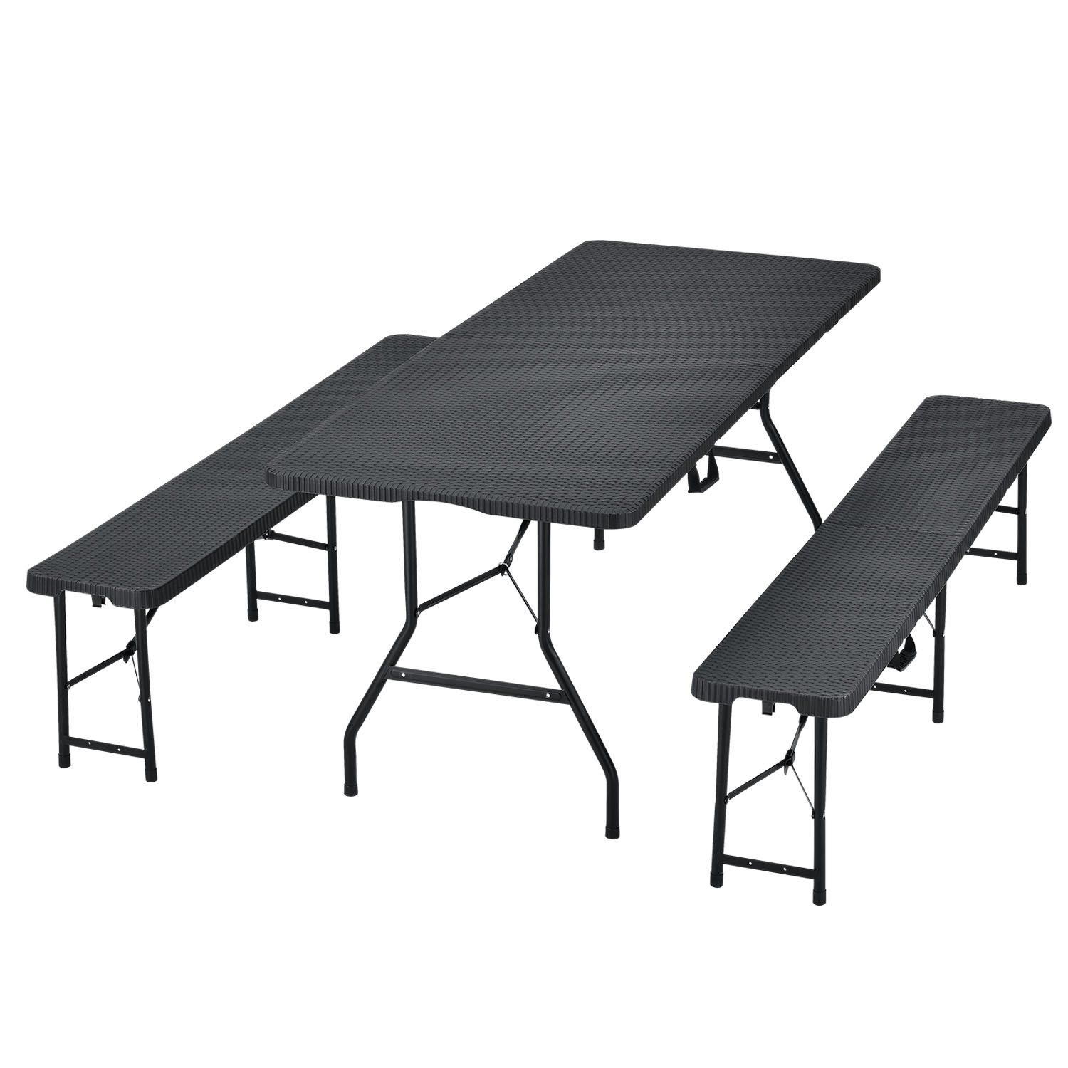 Skládací set Amberg se skládá z velkého stolu a dvou lavic. Lze jej rychle umístit na zahradě, na balkoně nebo terase. Díky funkci skládání lze kempinkový stůl a dvě lavice složit a odložit, abyste ušetřili místo. Ideální pro skladování v suterénu nebo garáži. Díky úchytům, nízké hmotnosti a funkci kufru se sada dá snadno přenášet a přepravovat téměř v jakémkoli kufru auta. Rámy jsou vyrobeny z práškovaného kovu a nabízejí vysokou stabilitu. Bezpečnostní západky a kroužky na rámu zabraňují náhodnému zhroucení stolu a lavic. Povrchy jsou vyrobeny z plastu odolného vůči povětrnostním vlivům a UV záření. Odolný materiál lze po párty snadno vyčistit vlhkým hadříkem. Chrániče pod nohama chrání citlivé povrchy před nepěknými škrábanci.