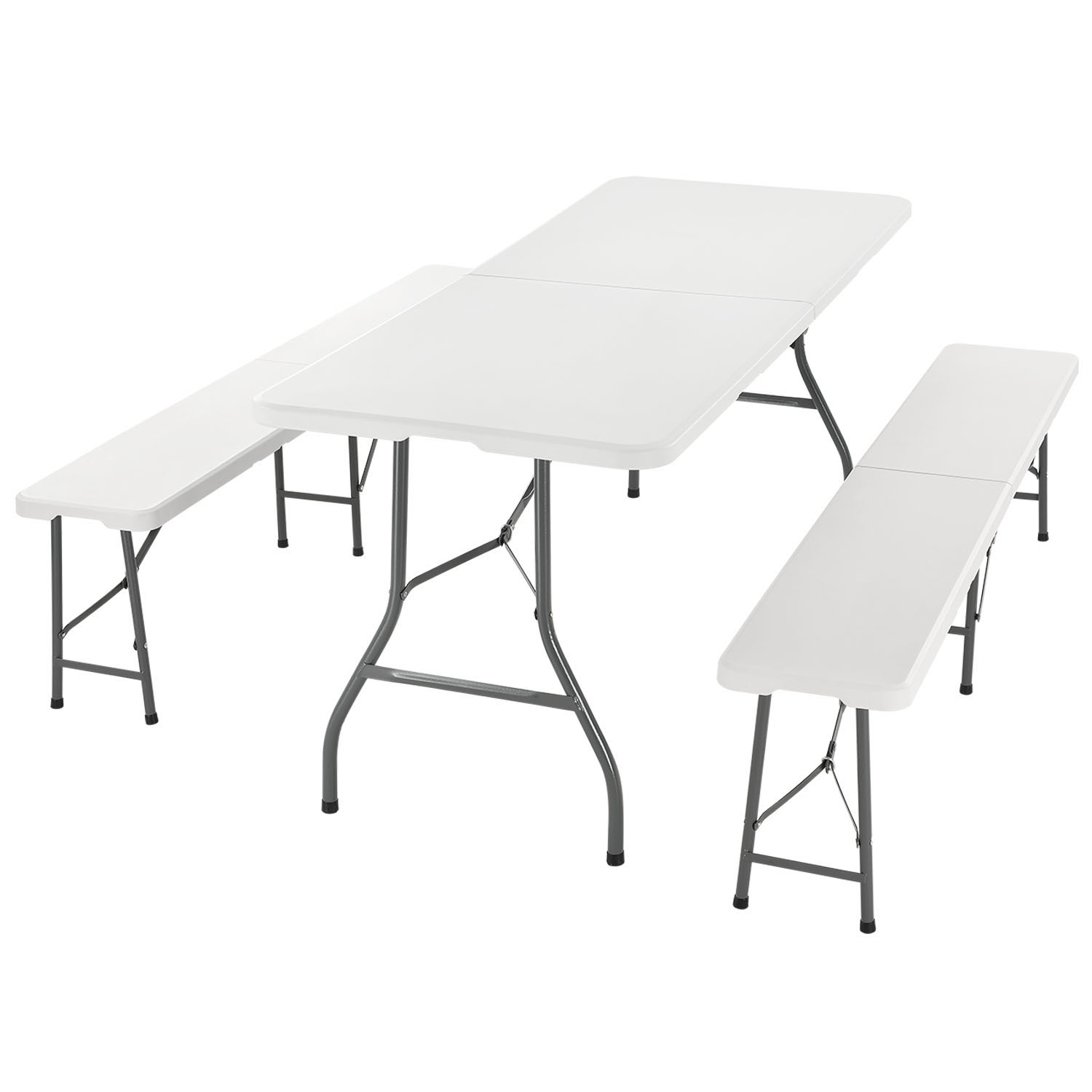 Díky funkci skládání lze kempinkový stůl a dvě lavice složit a odložit, abyste ušetřili místo. Ve složeném stavu má stůl pouze 90 x 70 x 9 cm, dvě lavice pouze po 90 x 30 x 9 cm. Ideální pro skladování v suterénu nebo garáži. Díky úchytům, nízké hmotnosti a funkci kufru se sada dá snadno přenášet a přepravovat téměř v jakémkoliv kufru.