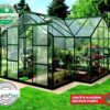 Konstrukce skleníku je vyrobena z kvalitních eloxovaných hliníkových profilů 1,2 mm, kdy výrobce poskytuje smluvní záruku 15 let na AL konstrukci. Zasklení skleníku je tvořeno velmi kvalitním dvoustěnným komůrkovým polykarbonátem o tloušťce 6 mm MARLON LONGLIFE (výrobce Brett Martin - Velká Británie), nebo SUNLITE (výrobce Palram Německo). Polykarbonát má silný UV filtr, takže nekřehne ani nežloutne. Světelná propustnost desek je cca 80 %, což plně dostačuje pro pěstování květin a zeleniny. Polykarbonát splňuje veškeré podmínky pro udělení atestace zdravotní nezávadnosti toxikologickým centrem vydaným státním zdravotním ústavem. Můžete si tak nerušeně pěstovat zeleninu bez obav o své zdraví. Smluvní prodloužená záruka 10 let na nerozbitnost krupobitím je u LANIT PLASTU samozřejmostí. Prosklení je do hliníkových profilů kotveno pomocí ocelových sponek. Pokud by vás tento skleník zaujal, ale spíše byste uvítali skleněné výplně, podívejte se na varianty se sklem.