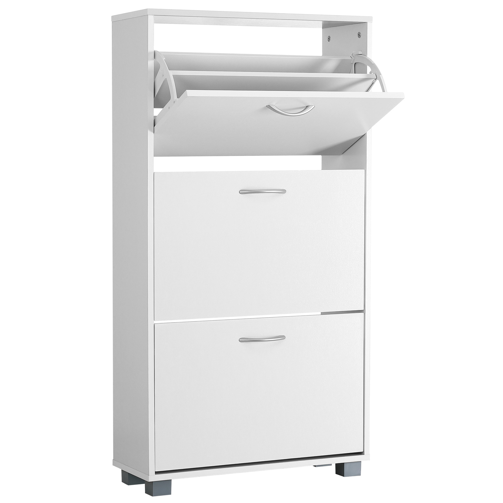 Nadčasová skříňka na boty se 3 prostornými policemi - elegantní řešení pro přehledné uložení bot. Botník vás přesvědčí moderním designem, prostorově úspornou velikostí. Tři prostorné police s rukojeťmi v hliníkovém vzhledu vám nabízejí dostatek prostoru pro všechny vaše boty. Botník díky svému nadčasovému modernímu designu dokonale zapadne do každého interiéru. Díky hloubce 24 cm je dostatečně úzký, aby našel místo iv malé chodbě.