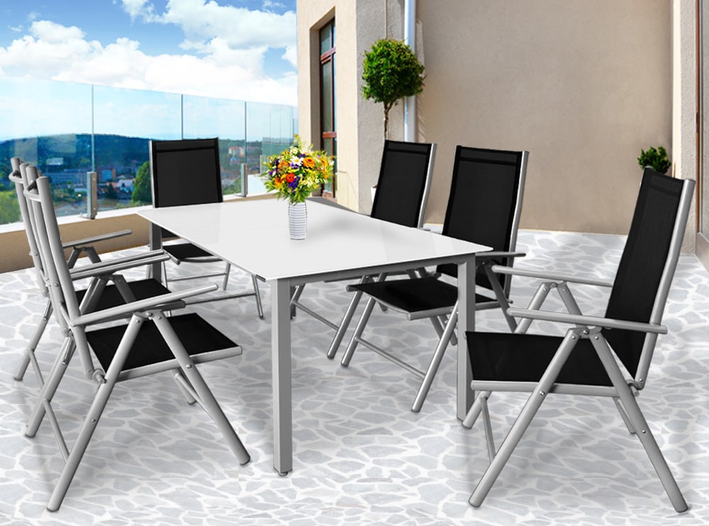 Zahradní sestava Bern pro 6 osob z hliníku Exkluzivní 7-dílná zahradní souprava Bern z hliníku se stolovou deskou z bezpečnostního skla s vysokou pevností, skládací židle s vysokým opěradlem, které…