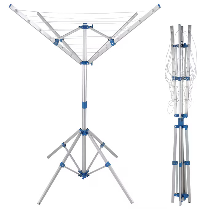 Rotační sušák na prádlo s délkou linky 14m se skládá ze 2 částí, které lze rychle a jednoduše sundat. Skládací hliníkový rám je nastavitelný, proto si rotační sušák můžete přizpůsobit svým individuálním potřebám. Je odolná vůči povětrnostním vlivům a nabízí dostatek prostoru pro všechny druhy prádla a stojí na 4 pevných hliníkových nožičkách. Chcete-li umístit rotační sušák na prádlo na trávník, přiložené 4 pozemní kolíky vám pomohou připevnit nohy.