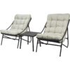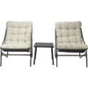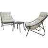 sada zahradního nábytku 3ks, kd, 2ks ocelové relaxační křeslo a 1ks ocelový stůl. ocelová trubka a deska stolu s práškovým nástřikem v matné tmavě šedé barvě, křeslo s 2x1 závěsem v tmavě šedé barvě, každé křeslo s polštářem z béžové olefinové tkaniny, vyplněné polyesterovou pěnou. rozměr židle: 66,5x86,5xh81,5 cm, rozměr stolu: 45x45xh42 cm.