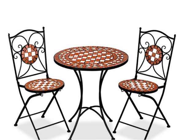 Zahradní sada vytvoří u vás doma středomořskou atmosféru. Ručně opracovaný mozaikový vzor je obzvláště jedinečný. Ať už uvnitř nebo venku, díky rustikálnímu designu bude sedací část upoutat pozornost ve vaší domácnosti. Stolní deska z těžké kamenné mozaiky stojí na stabilních ocelových nohách. Díky funkci skládání lze židle sundat a uložit, aby se ušetřilo místo. Stabilní zahradní nábytek se vyznačuje svojí odolností a zároveň je odolný vůči povětrnostním vlivům, proto je sestava ideální pro trvalé venkovní použití. Na zimu je vhodné zahradní sestavu zakrýt, aby byla chráněna před mrazem.