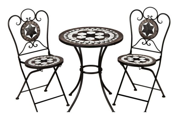 Zahradní sada vytvoří u vás doma středomořskou atmosféru. Ručně opracovaný mozaikový vzor je obzvláště jedinečný. Ať už uvnitř nebo venku, díky rustikálnímu designu bude sedací část upoutat pozornost ve vaší domácnosti. Stolní deska z těžké kamenné mozaiky stojí na stabilních ocelových nohách. Díky funkci skládání lze židle sundat a uložit, aby se ušetřilo místo. Stabilní zahradní nábytek se vyznačuje svojí odolností a zároveň je odolný vůči povětrnostním vlivům, proto je sestava ideální pro trvalé venkovní použití. Na zimu je vhodné zahradní sestavu zakrýt, aby byla chráněna před mrazem.